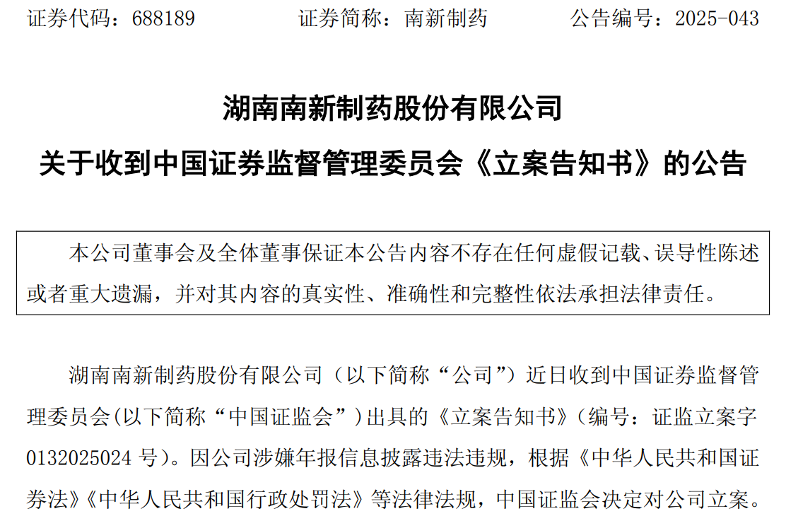9月30日晚间,南新制药(688189)发布公告称,公司近日收到中国证监会出具的《立案示知书》。因公司涉嫌年报信息败露非法违纪,中国证监会决定对公司立案。