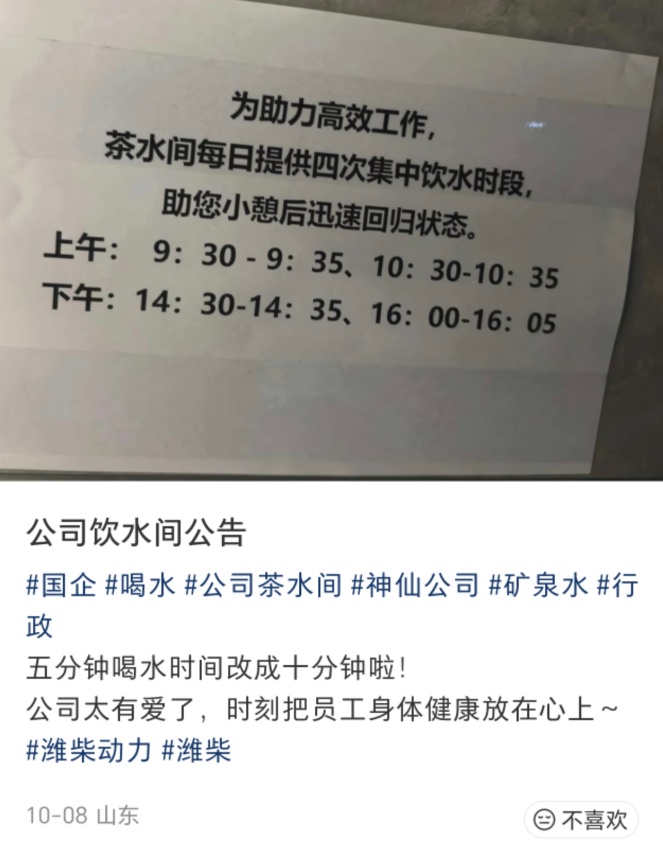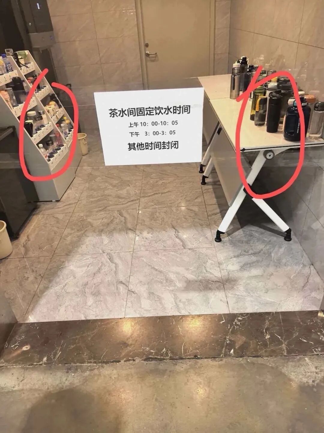 此外,该网友还在批驳区晒出另一张像片,内容是该公司此前张贴的 “茶水间固定饮水时分”见知,其时仅允许高下昼各一个时段饮水,共计相配钟,步履明确标注:上昼10:00-10:05;下昼3:00-3:05,其他时分阻滞。”批驳区不少网友示意诧异。