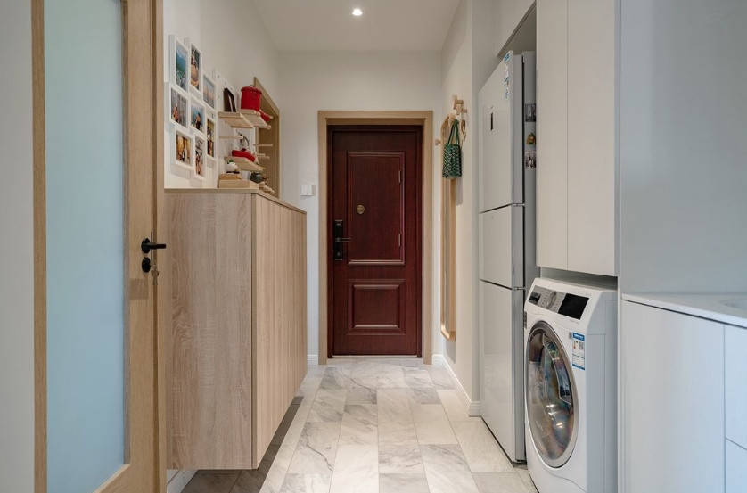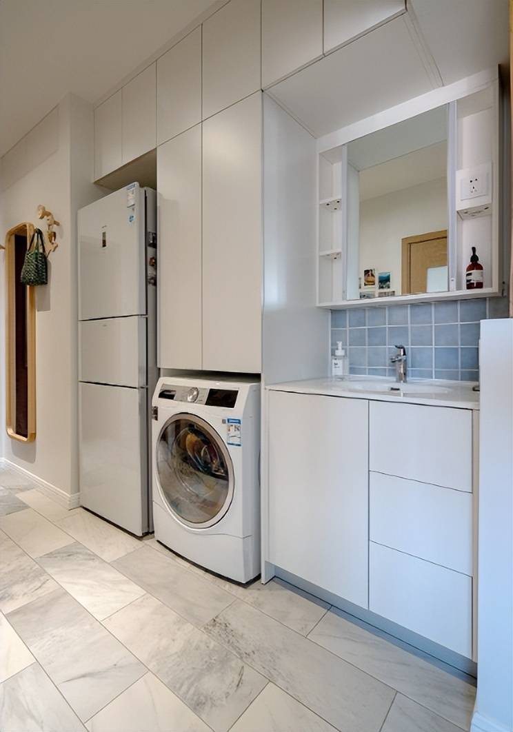 卫生间作念了干湿分离计算,将盥洗区移至过谈,同期把过谈空间利用起来,把雪柜和洗衣机等镶嵌式摆放其中,给厨房和卫生间腾出了不少使用空间。柜体赞助选拔白色,搭配从简利落的计算,空间愈加干净整洁。