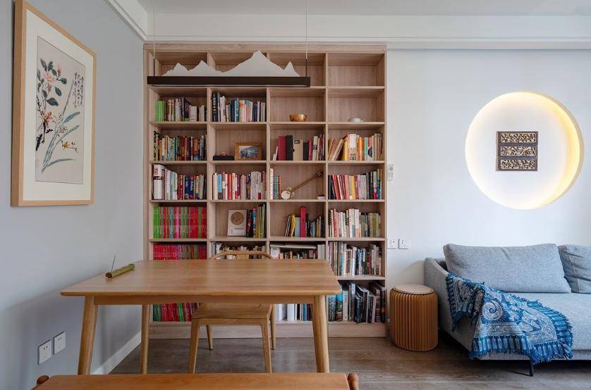 餐厅作念了到顶的落地书架,称心了屋主无数册本的摆放,同期也丰富了客餐厅空间。餐厅吊灯,别致的外不雅造型,宛如连绵转念的山峦,与沙发布景里的老旧挂屏,有一种精神上的呼应,传达出了收用里独到的韵味。