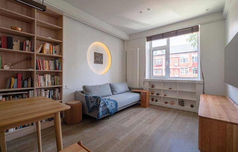 沙发墙作念了能够造型,圆形内镶嵌暖色灯,为空间增添温馨感。空间有限客餐厅挨着相比近,但不影响使用。