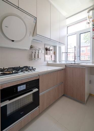 厨房小巧实用,木色的柜体搭配淡色的瓷砖,把收用的清雅体现的大书特书。空间诚然有限,但收纳空间依然不可少,除了橱柜外还加多了洞洞板收纳,减少了台面上的小物件,省出了更多操作空间。