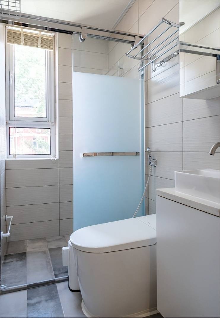 卫生间空间也不是很奢靡,色彩上愚弄了相比清雅的浅米色墙砖搭配水墨感的浅深地砖,举座效能还可以。磨砂玻璃门计算,玄机性可以,透光效能也可以。
